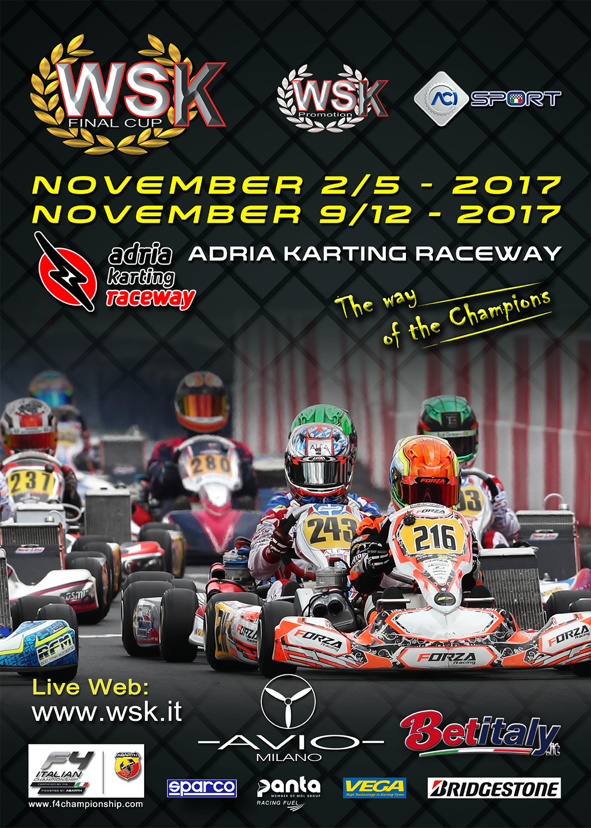 Najbliższe dwa weekendy wielu znakomitych kierowców spędzi ponownie we Włoszech. Tym razem zawodnicy przenoszą się do Adrii gdzie w dwóch imprezach powalczą w prestiżowym WSK Final Cup. Pierwsze finały już w najbliższą niedzielę – 5 listopada, kolejne w następną – 12 listopada.