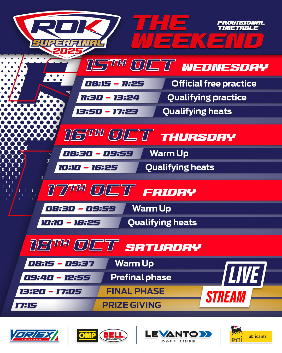 Informujemy, że dostępny jest już oficjalny harmonogram zawodów Superfinału ROK Cup 2025, który odbędzie się na legendarnym torze South Garda Karting w Lonato (Włochy).