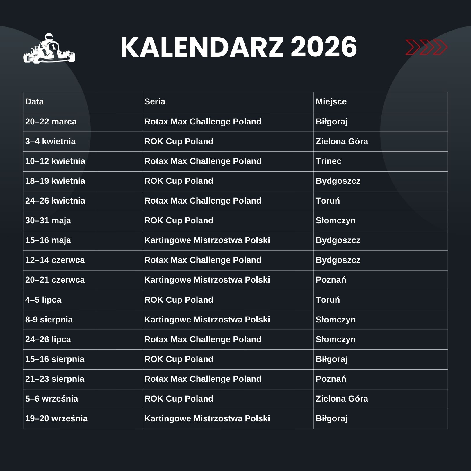 Oficjalny harmonogram ROK Cup Poland, Rotax Max Challenge Poland oraz Kartingowych Mistrzostw Polski na sezon 2026 został już ogłoszony. Przed Rokersami miesiące pełne intensywnej rywalizacji, sportowych wyzwań i emocji, które od lat stanowią znak rozpoznawczy tej serii. Sześć rund rozgrywanych na pięciu zróżnicowanych torach oznacza długą walkę o każdy punkt i sezon, który zapowiada się wyjątkowo widowiskowo.